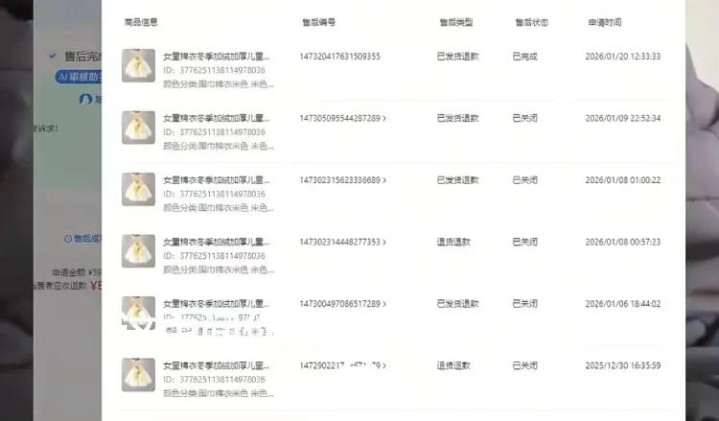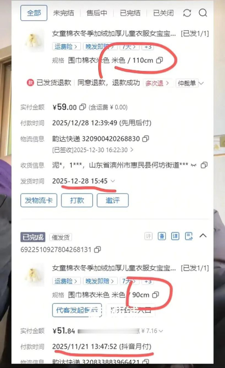 事情要从两笔订单提及。山东一位买家,在11月下面单了一件90码的童衣,一个多月后,又回购了同款的110码。店主合计是碰到了酣畅的回头客,怡然发货。