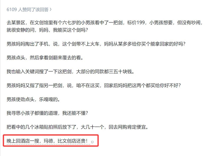 驳斥区有东说念主共享了我方的真实故事,说自家男儿在景区想要玩物,可在景区买一个的钱,网上能买5个。是以就没买,效果到家后网购,到货了,男儿也不答应了,因为他仍是不想要了。