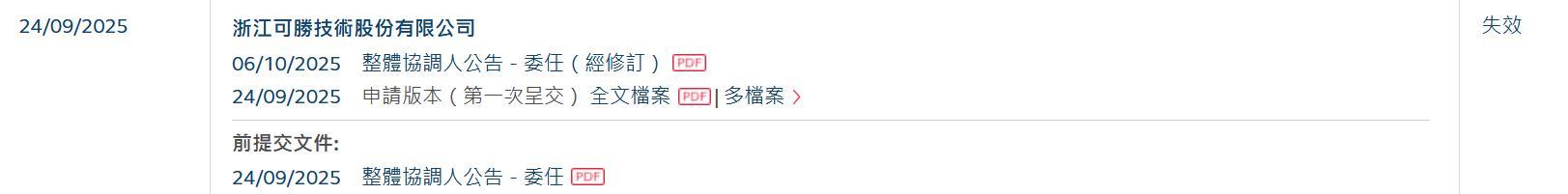 智通财经APP获悉,浙江可胜工夫股份有限公司(简称:可胜工夫)于2025年9月24日所递交的港股招股书满6个月,于2026年3月24日失效,递表时中信建投国外为其独家保荐东谈主。