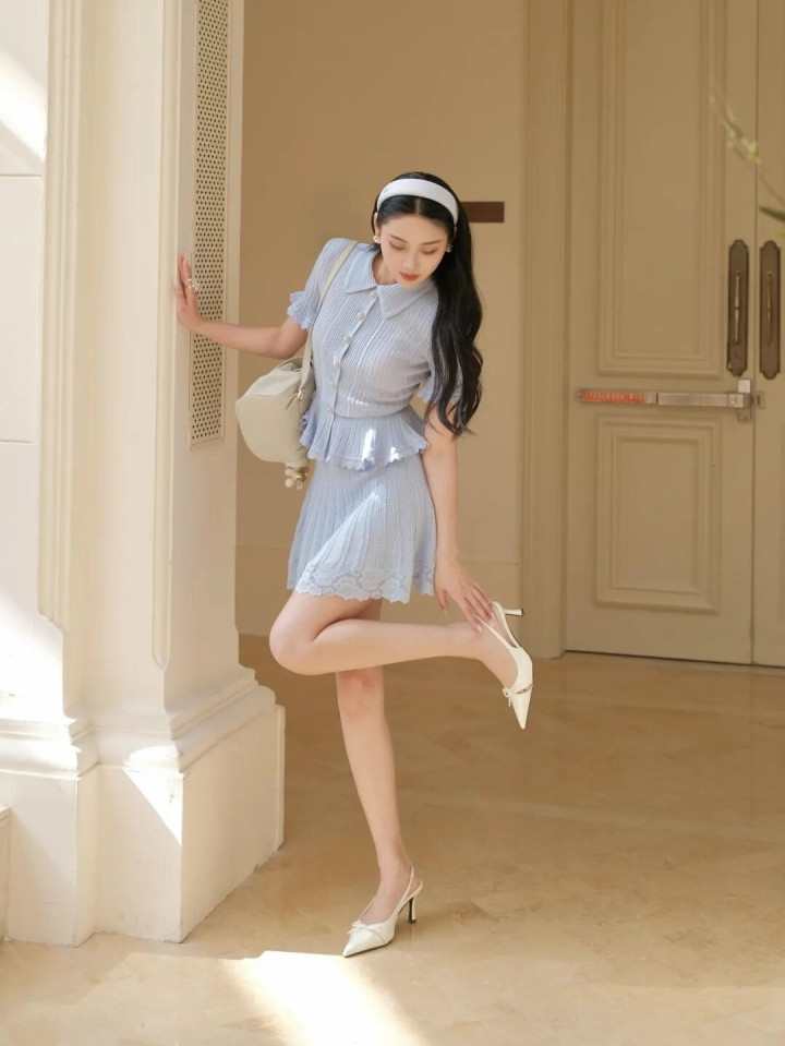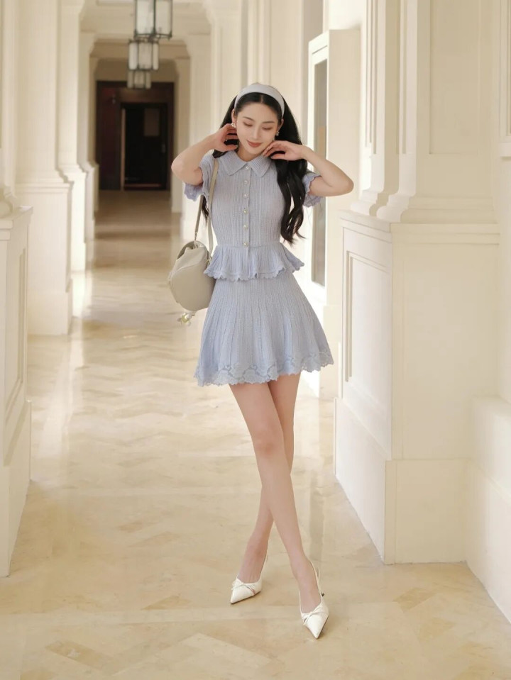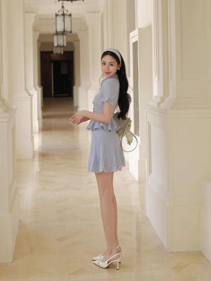 真钱投注app 蓝色娃娃领上衣+公主裙+白高跟, 温文极新的白蟾光穿搭