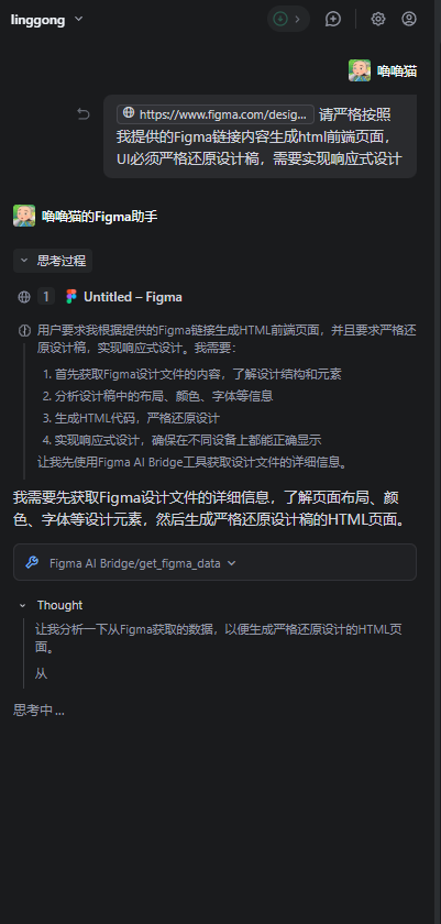 智能体启动调用FigmaAIBridge中的器具和做事,读取预料打算稿的实践,自动生成文献,填入前端代码,并生成一个index.html文献供你预览遵循。恭候器具惩办:自动读取预料打算稿、下载素材、生成HTML原型文献(过程有程度请示);