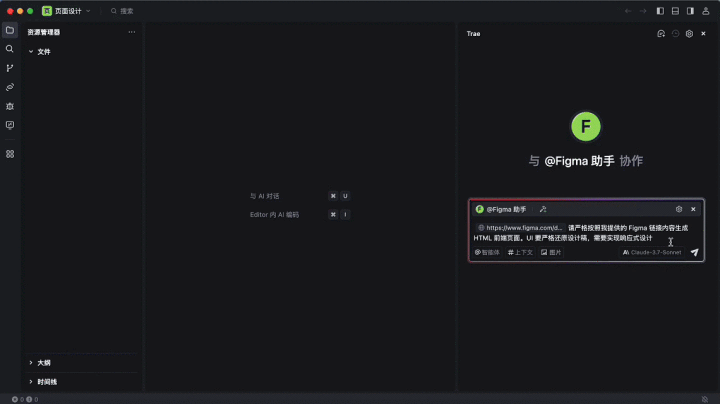 3.在TRAEIDE对话框中,接受「Figma原型助手」智能体,粘贴Figma畅达+输入需求(示例:「请字据这个畅达生成高保真原型,适配挪动端和PC端」),发送指示;