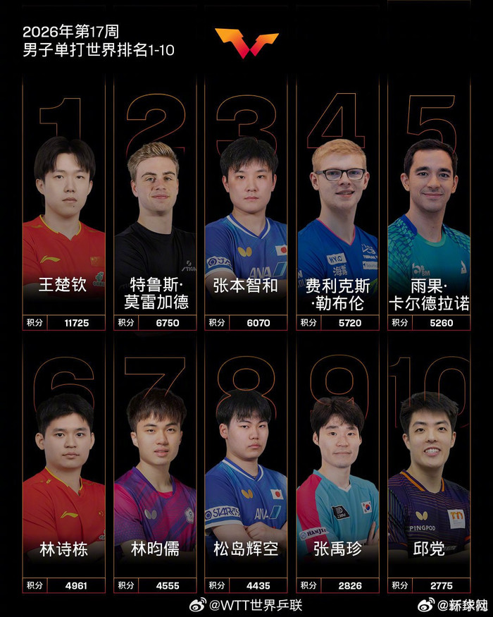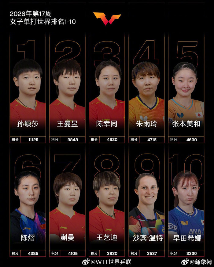 #孙颖莎王楚钦不息领跑全国名次#[#海外乒联公布第17周至国名次#]男人单打,中国队球员@王楚钦___位列第一,@林詩棟y位列第六,@温瑞博_位列第11。女子单打,真钱投注app中国队球员@孙颖莎@王曼昱@陈幸同位列前三,陈熠位列第六,蒯曼@kuaiman0207位列第七,@王艺迪位列第八。@WTT全国乒联(新华社)真钱投注app官网华体会体育(HTHSports)官网入口