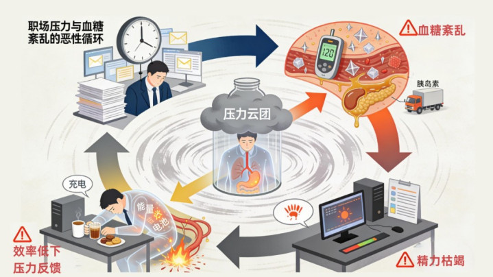 元气心灵差时,东谈主们本能地寻求高糖食品快速看守,却可能激励下一轮更剧烈的血糖波动。加上压力导致的就寝差、饮食乱,容易堕入“压力大→血糖乱→元气心灵差→恶果低→压力更大”的负面闭环。