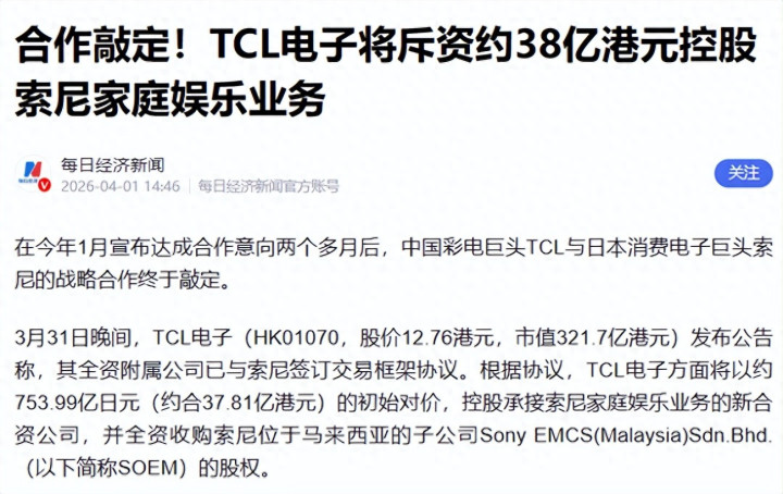 2026年1月,一条看似“企业配合”的公告,把好多东说念主对日本制造的终末一层滤镜撕开了一角,索尼告示将家庭文娱业务中与电视整机有关的运营交由中国TCL主导,以合伙体式鼓励。