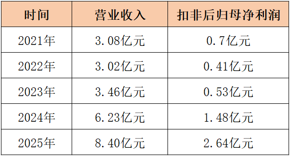 公开数据涌现,2021年至2025年,营业收入辞别为3.08亿元、3.02亿元、3.46亿元、6.23亿元和8.40亿元,扣非后归母净利润辞别为0.7亿元、0.41亿元、0.53亿元、1.48亿元和2.64亿元。