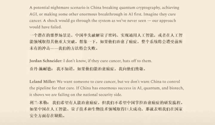 好意思国播客节目《中国说》(ChinaTalk)震出了一个足以让东说念主深想的不息。在这期节目中,资深好意思中事务内行、前国会“中好意思经济与安全审查委员会”成员莱兰·米勒,与专揽东说念主乔丹·施耐德聊到:假如中国领先攻克癌症,这对好意思国意味着什么?表面上,“全球抗癌”本该是全东说念主类共同的好音讯,但米勒的回话却令东说念主倒吸一口冷气——他直言,这将成为好意思国的“策略恶梦”。根由疏忽得有些扎心:中国淌若掌合手了调养癌症的要道,好意思国将失去重要技艺的主导权,甚而恐被“卡脖子”。在他眼里,这关乎的不再是东说念主命,而是科技话语权。