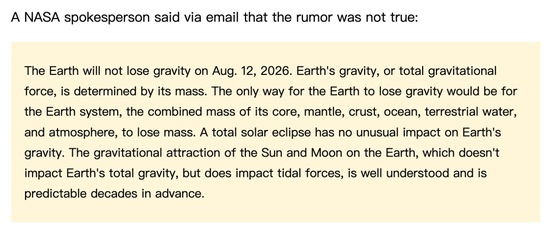 濒临坏话扩散,NASA通过国际巨擘事实核查网站Snopes明确表态:“地球毫不会在2026年8月12日失去引力,这一说法毫无科学依据”。