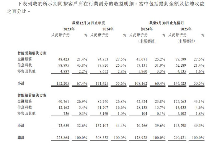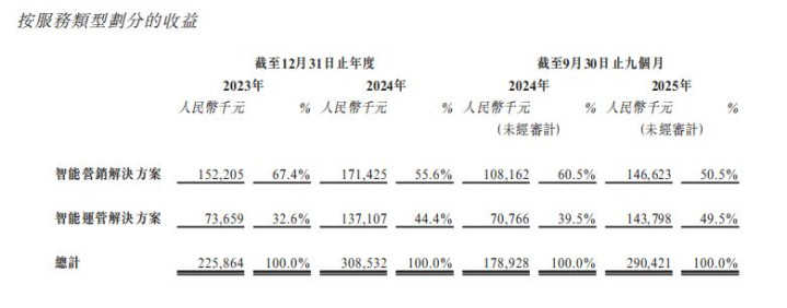 更障碍的是收入组成,众安信科招股书浮现,其智能营销经管决议占比由2023年的67.4%降至2024年的55.6%,在2025年前9个月降至50.5%;智能运管经管决议占比则由32.6%升至44.4%,再升至49.5%。这不仅仅边界扩大,营销收入占比虽仍略高,但运管收入占比已接近各占一半。