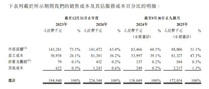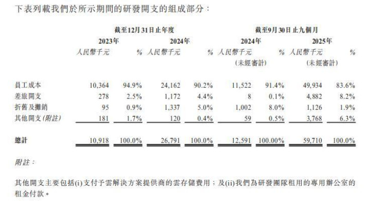 从其研发开支的组成看,2023年、2024年及限定2025年9月30日止9个月,差旅开支在研发开支中的占比区别为2.5%、4.4%和8.2%,折旧及摊销占比区别为0.9%、5.0%和1.9%,其他开支占比区别为1.7%、0.4%和6.3%。招股书对“其他开支”的界定,主如果云存储用度和研发团队专用办公形式房钱付款。