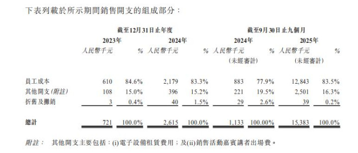 值得原宥的是,众安信科的销售开支中,职工资本占比在2023年为84.6%,2024年为83.3%,2025年前9个月为83.5%。