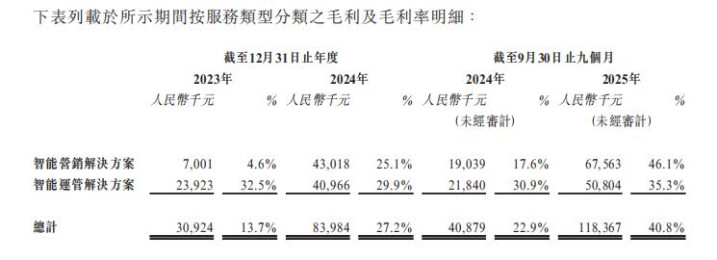 对于智能营销毛利率由2023年的4.6%升至2024年的25.1%的情况,招股书称,“主要由于与支付予主要电讯公司的数位通讯干事费减少,乃因咱们加强了客户里面的营销技艺,使咱们的智能营销经管决议大幅裁汰了客户对第三方营销干事的依赖。”