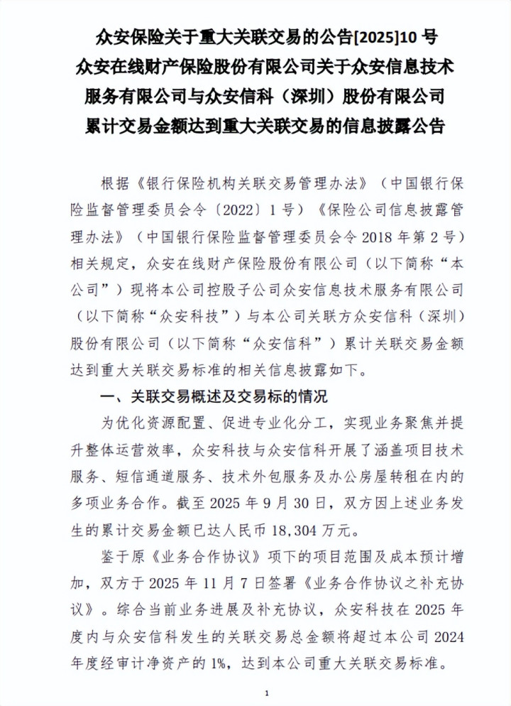 值得一提的是,2025年11月28日,众安保障对于紧要关联来去的公告[2025]10号众何在线财产保障股份有限公司对于众安信息时间干事有限公司与众安信科(深圳)股份有限公司累计来去金额达到紧要关联来去的信息清楚公告浮现,其控股子公司众安科技与众安信科因款式时间干事、短信通说念干事、时间外包干事及办公房屋转租等和谐,限定2025年9月30日累计来去金额已达1.8304亿元。