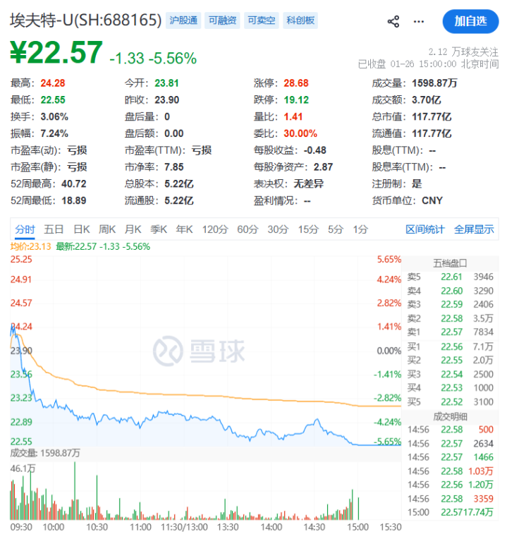 {jz:field.toptypename/}遏抑1月26日收盘,埃夫特股价报22.57元/股,总市值为117.77亿元。