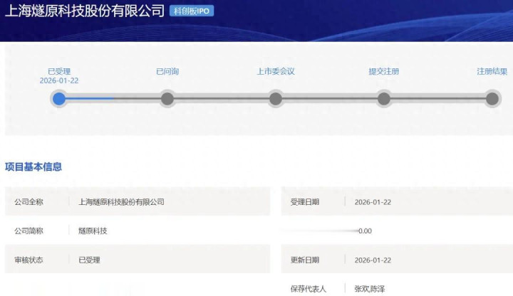 1月22日,上海燧原科技股份有限公司科创板IPO获上交所受理,成为2026年第一家被受理的科创板IPO公司。公司本次IPO拟融资60亿元,保荐机构为中信证券。