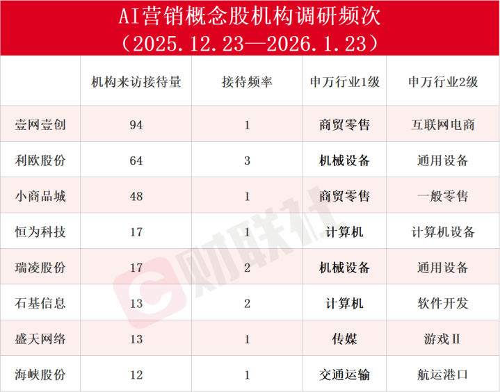 据Choice数据清楚,在2025年12月23日-2026年1月23日历间获机构调研的AI营销成见股包括壹网壹创、利欧股份、小商品城、恒为科技、瑞凌股份、石基信息、盛天汇注和海峡股份。具体情况如下: