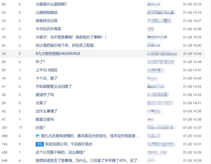 靠近股价大跌,好多投资者也颇感猜疑,多位投资者在股吧发帖接头“出什么事情了”,也有投资者吐槽称,其此前通过其他股票半年赚了40%,买了九方智投后一天就跌完结。