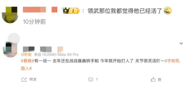 春晚当晚,#机器东谈主全面入侵春晚#登上微博热搜第二。止境是看过宇树机器东谈主的技击扮演后,有东谈主直言“领武那位我都认为他依然活了”;还有东谈主感触“旧年还战战巍巍转手帕,本年就启动打东谈主了”;更有东谈主示爱,“我告示,我爱上机器东谈主了”。