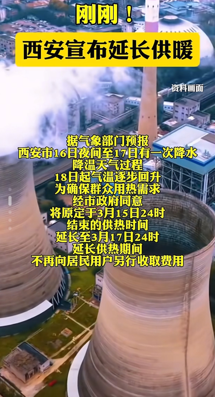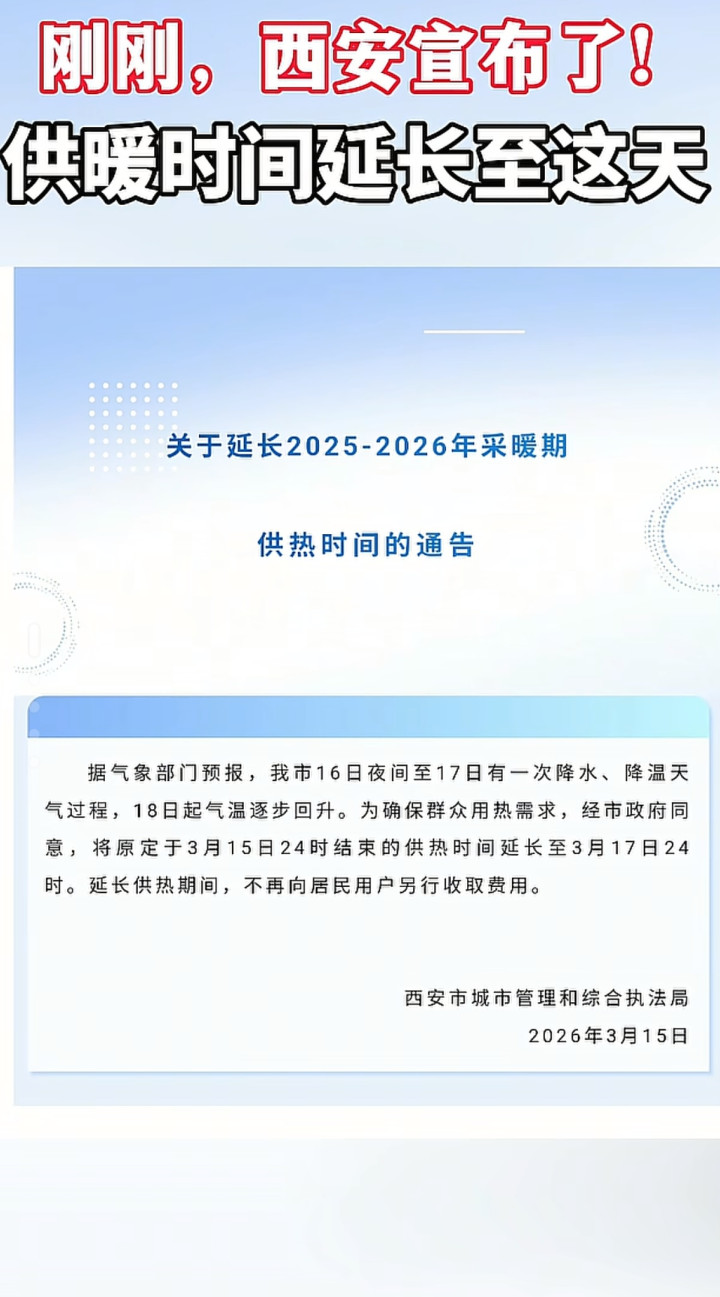 3月15日西安市城管局发布文告,因时势预告16昼夜间至17日西安将迎来降水降温,18日气温才会渐渐回升,为保险人人用热需求,经市政府愉快,将原定于3月15日24时为止的供暖,延伸至3月17日24时,且延伸供暖时分,不会向住户另行收取任何用度。
