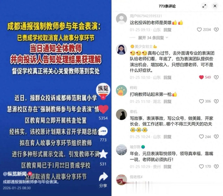 1月下旬,有世界向相关部门投诉,称成齐师范附庸小学慧源校区强制整体西宾参与期末总结会中的“育东说念主故事共享”智商,条件西宾通过扮演等形式展示疏通。这一安排让本就处于期末使命高压下的西宾们倍感不悦。