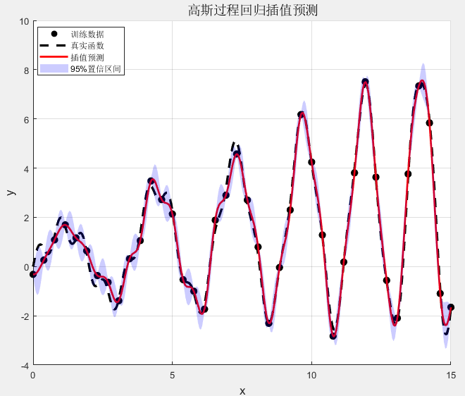 用这两个函数或者仿真一下,生成了一个复杂的非牢固的函数,然后给出30个侦查数据,侦查数据中迥殊添加了测量弊端,临了把展望值和骨子的放在一块比拟。