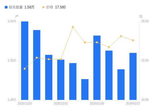 日历A股户数(户)流畅A股户均握股数(股)户均握股市值(万元)2026-02-271575841517.7672.992026-02-131542442416.6176.822026-02-101580441396.7369.222026-01-301611140607.9070.372026-01-201522443687.1975.622026-01-091555042771.1482.422025-12-311562142576.7464.672025-12-101571842325.1064.252025-11-281622341007.5863.072025-11-201639940567.2756.67