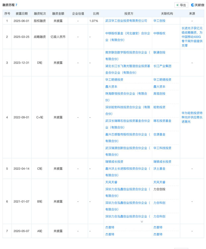 天眼查App信息涌现,也恰是自2020年5月起,天博体育出息光子运转引进外部投资,陆续取得杰普特、天风天睿、力合创投、瑞银成长投资、沃土基金、高瓴创投、华为旗下哈勃投资、中国联通旗下联通创投、长江产业集团、中国迁移旗下中移基金、华工创投等机组成为股东。