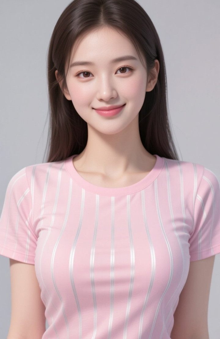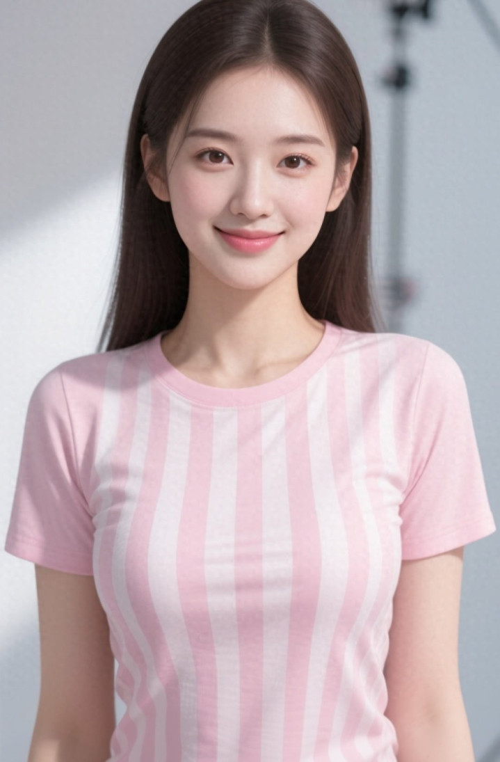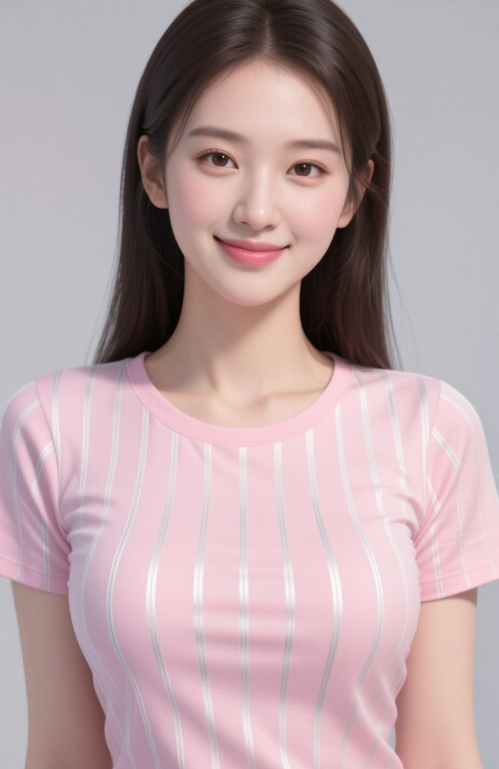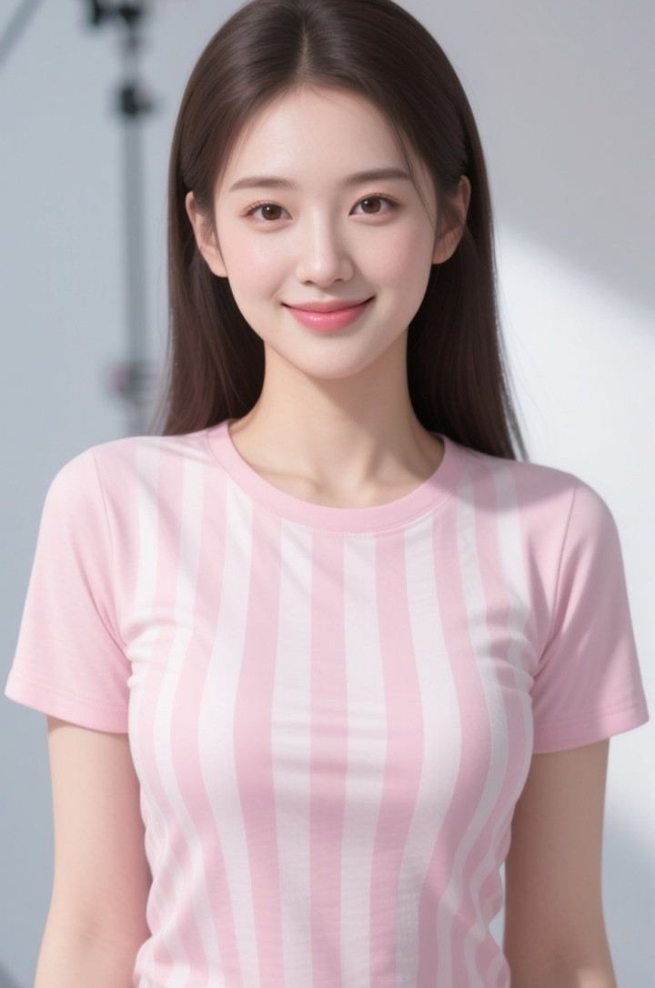 真钱投注平台 穿粉白条纹短袖衫好意思女
