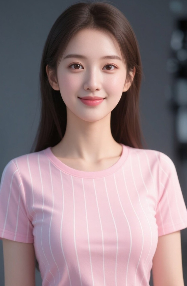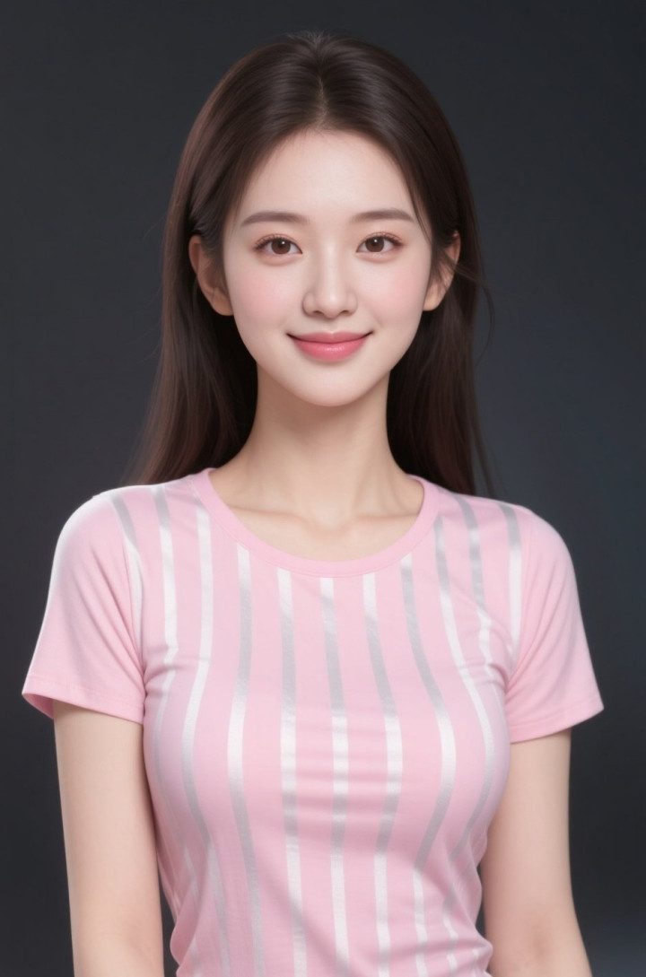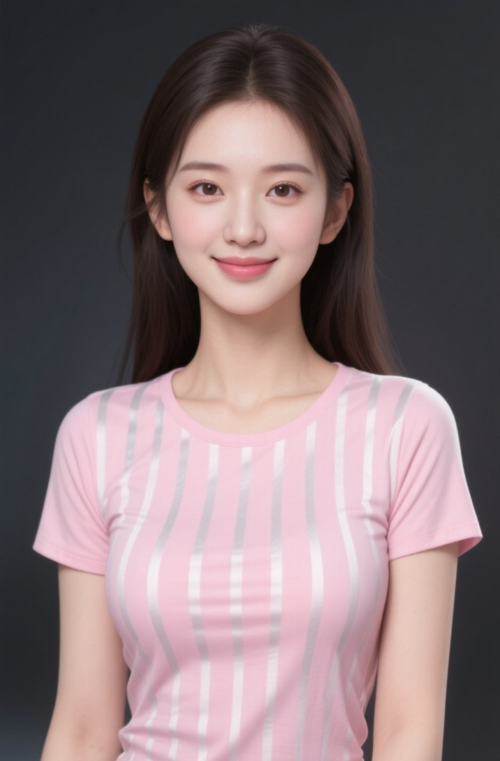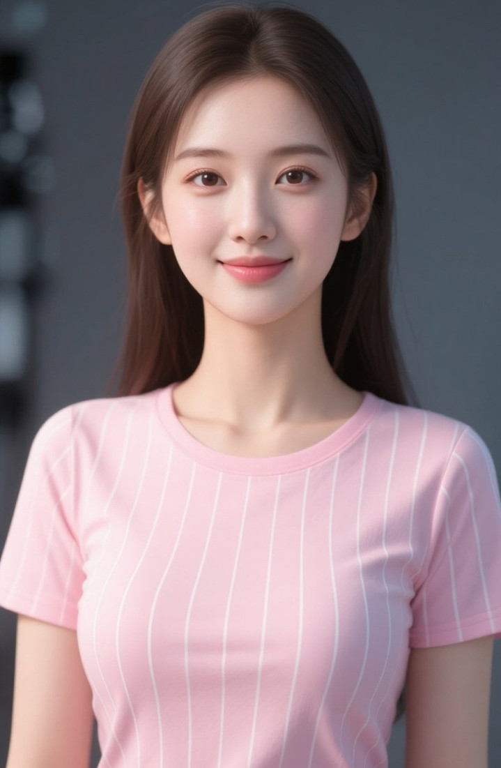 真钱投注平台 穿粉白条纹短袖衫好意思女