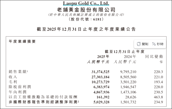 财报裸露,老铺黄金期内收入273.03亿元东谈主民币,同比增长221.0%;母公司统统者应占盈利为48.68亿元,同比增长230.5%;毛利增长193.4%至约102.74亿元。