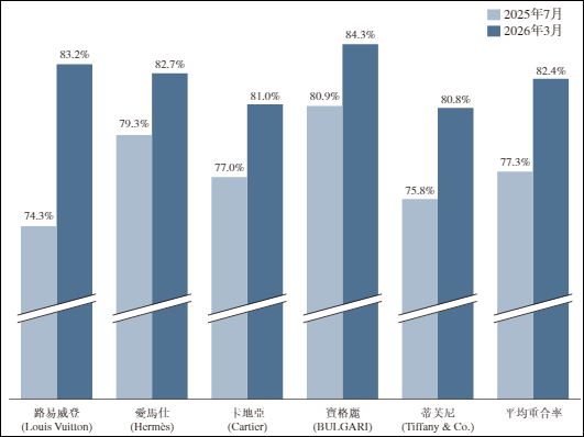 弗若斯特沙利文调研远程裸露,老铺黄金耗尽者与路易威登、爱马仕、卡地亚、宝格丽等外洋五大奢华牌的耗尽者平均重合率从2025年7月的77.3%栽种至2026年3月的82.4%。财报原文指出,“老铺黄金耗尽者与外洋奢华牌东谈主群高度重合,具备高端耗尽脾性,考据了品牌的高端定位。”