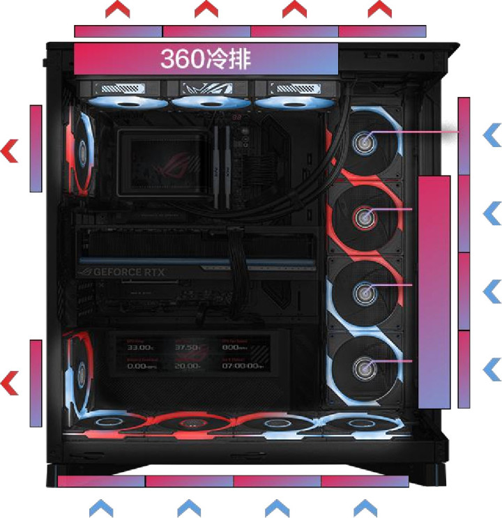 关于一套平定脱手的主机来说,雅致的散热与膨胀支捏至关强大。ROG幻世神海景房机箱在这方面推崇出色,正规投注平台里面经过尽心境较,最多支捏装配14颗120mm电扇,并兼容双360mm冷排,不管是风冷也曾水冷决策均能平稳应付。机箱支捏高达180mm的风冷散热器,底部电扇进风推崇出色,即便主机高负载脱手也能保捏平定。搭配独有的可旋转式电扇支架,玩家可证据硬件布局无邪调治电扇角度,进一步优化机箱里面风谈,擢升收支风着力,确保主机在高负载下保捏平定。在膨胀方面,机箱兼容最新BTF背插主板,达成“零线缆”的浮现视觉着力;前置I/O面板提供双20Gbps Type-C接口及PD快充功能,知足高速数据传输与挪动竖立快速充电需求,为主机畴昔发展预留饱胀空间。