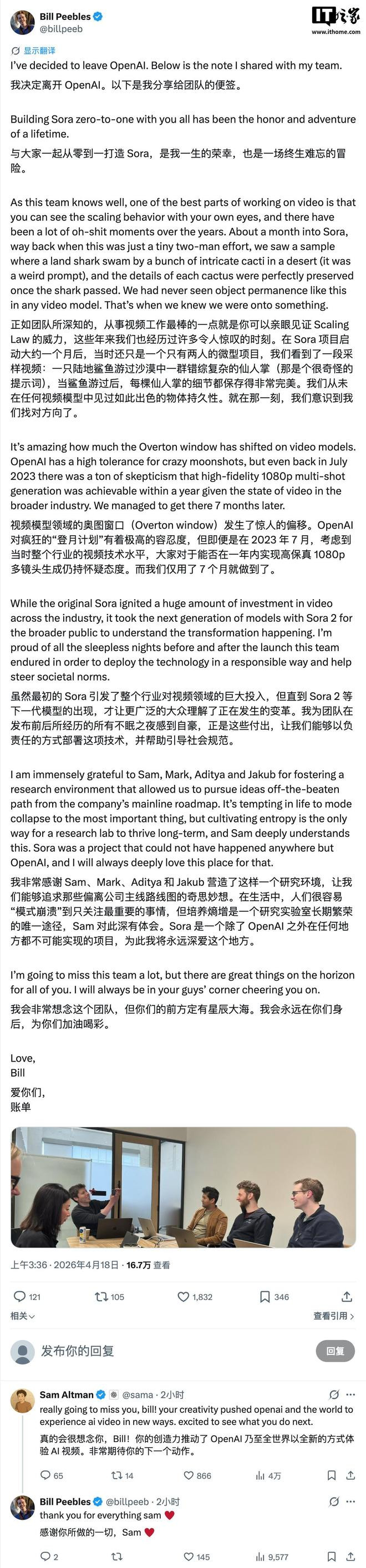 IT之家4月18日音问,当地技巧4月17日,OpenAI视频生成平台Sora厚爱东说念主比尔·皮布尔斯晓喻去职。公司正在盘曲战术,以减少“支线形势”,将重心转向编程和企业诓骗,皮布尔斯的离开恰是这一系列盘曲的一部分。