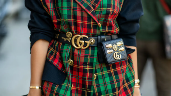 2018年9月巴黎时装周时间,一位捎带古驰腰带、手提古驰包的女士。