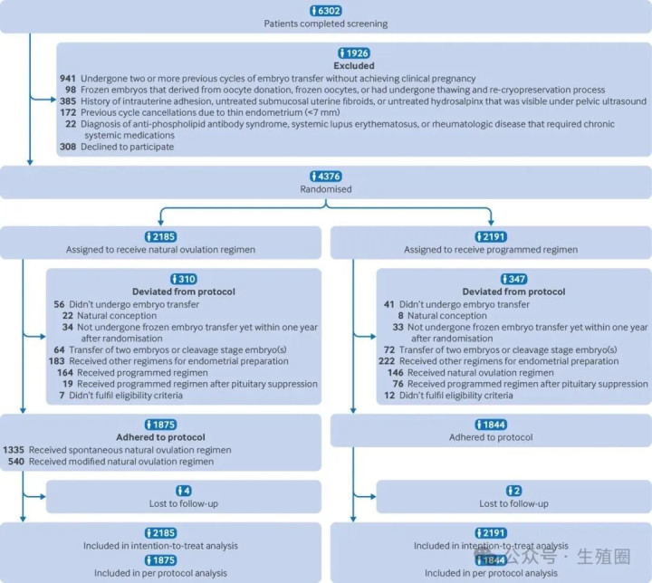 这个揣度共筛查了宇宙24家生殖中心的6302名女性,最终有4376东说念主参加揣度,天然周期组有2185东说念主,东说念主工周期组有2191东说念主。