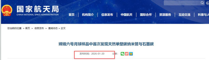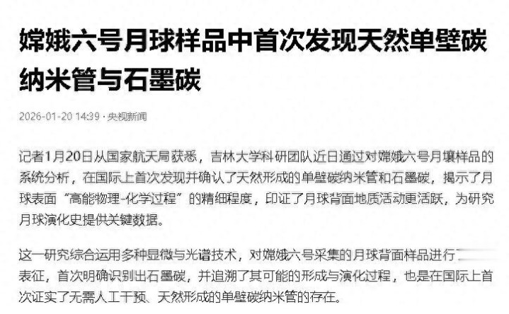 国度航天局2026-01-20《嫦娥六号月球样品中初度发现自然单壁碳纳米管与石墨碳》