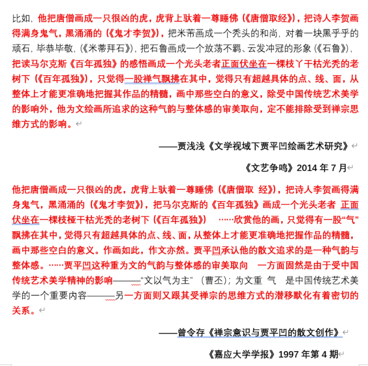 “抒怀的丛林”还发现,贾淡淡论文中对于贾平凹画作《唐僧取经》《鬼才李贺》《百年伶仃》等作品的描述,与学者曾令存1997年发表的《禅宗意志与贾平凹的散文创作》一文的文本存在大面积重叠。不仅画作称呼、具体意想描述,如“黑涌涌的”、“秃顶老者”等语句叠加,其对于贾平凹画图“追求气韵与举座感”、“受禅宗想维影响”的中枢不雅点及竣工申报段落也近乎一致,且未标注援用文件。
