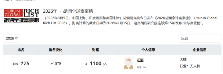 左证2026年胡润全球富豪榜,汪滔的钞票达到1100亿元,全球排行175,飙升了570名。